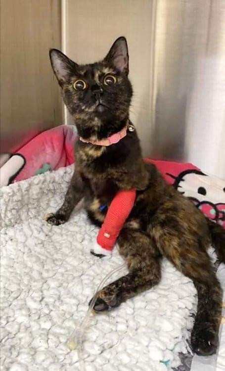 It’s still touch-and-go for Missy, a Tortoiseshell moggy, who the vets say may not make it. She is receiving physio from ‘the amazing’ team at Milestone vets, Kingsteignton, but may never walk again after being shot on July 12.
