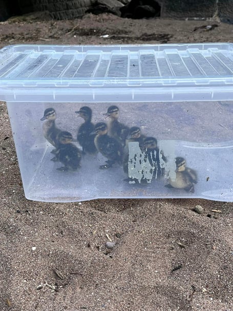 ‘We got the ducklings in box but it took a while to encourage mum to join them.’