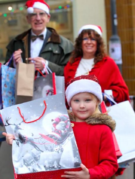 First in line for an early Christmas surprise was six-year-old Tyler-May Humphries, pictured here with Keith Stokes-Smith and his honorary elf-helper for the occasion, Sandra Perraton.